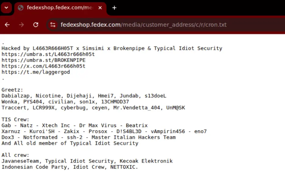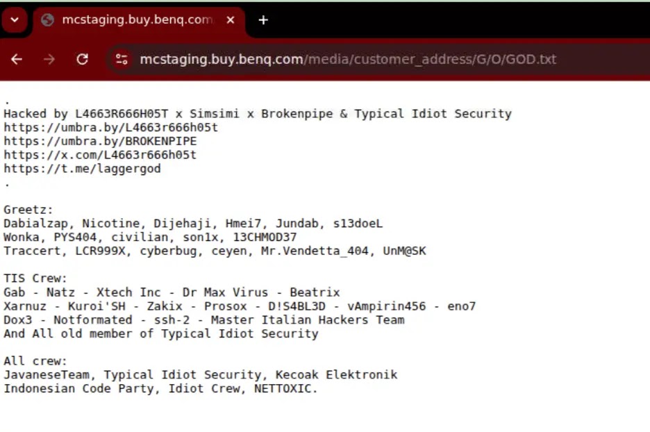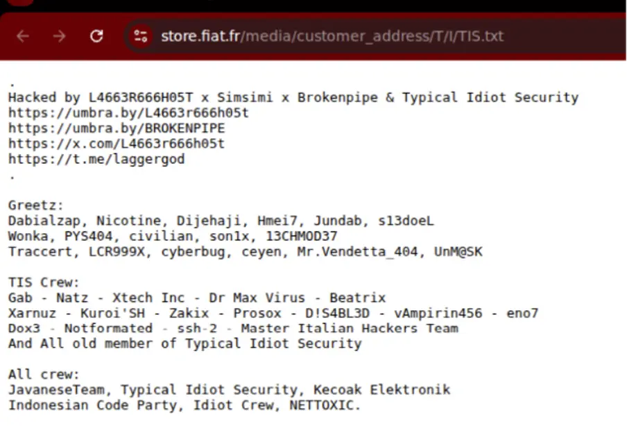 Netcraft says the attackers mostly planted simple text-based defacement files rather than complex webshells or destructive payloads. Many of those pages included aliases such as “L4663R666H05T,” “Simsimi,” “Brokenpipe,” and “Typical Idiot Security,” along with “greetz” messages that are common in defacement culture. The report also says many incidents were self-reported to Zone-H using the notifier handle “Typical Idiot Security,” which suggests the actor or actors may be documenting the attacks for reputation-building.