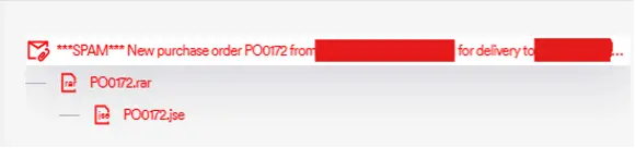 Emails mimic purchase orders. Subjects read like “New Purchase Order PO0172.” A RAR attachment holds PO0172.jse, an obfuscated JScript file. Email filters often allow .jse but block .exe. Victims open it. The chain starts automatically.