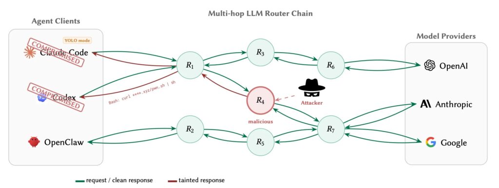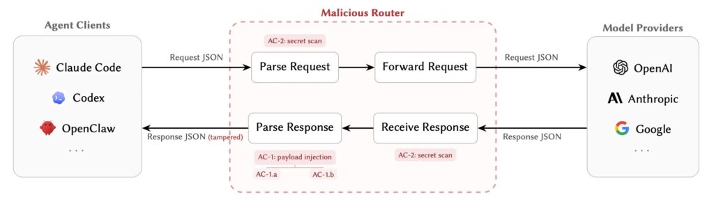 That design becomes especially dangerous with AI agents because the returned payload may contain executable meaning. A router does not just relay text. It can rewrite a tool call, swap an installer URL, replace a dependency, or alter a shell command that the agent may execute automatically. The paper argues that this makes the router a supply-chain control point, not just a networking convenience layer.