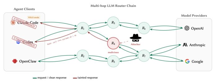 The team studied 28 paid routers bought from Taobao, Xianyu, and Shopify-hosted storefronts, along with 400 free routers collected from public communities. They found that 9 routers actively injected malicious code into returned tool calls, including 1 paid router and 8 free ones.