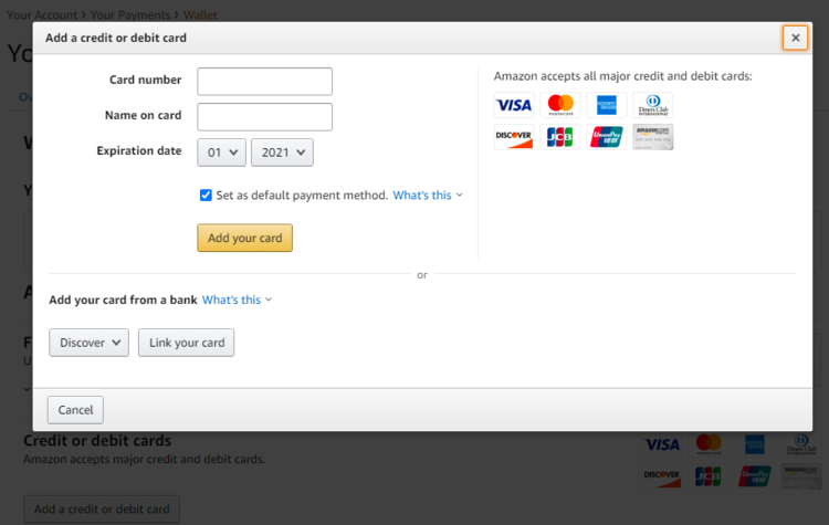For example, if you have an Amazon account created with US country settings, then you’ll need to provide a valid payment method (e.g. credit or debit card) issued from a US bank.