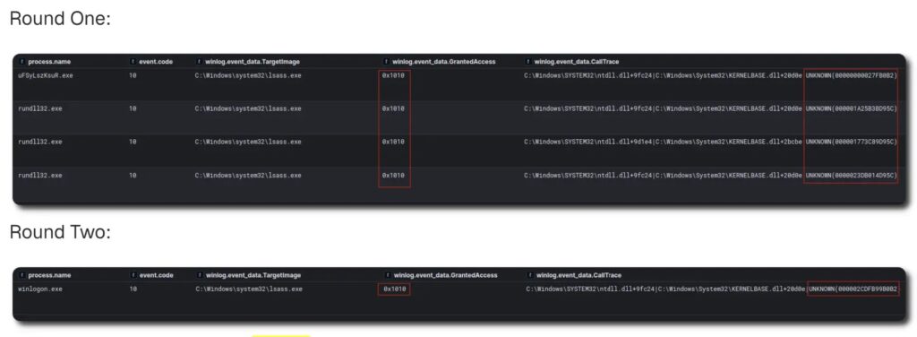 LSASS Credential Dumping Activity Observed in Sysmon Logs During Round 1 and Round 2 (Source – The DFIR Report)