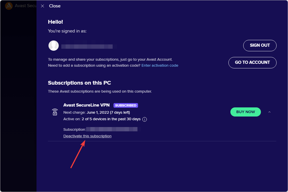 5. Then, click on Deactivate this subscription.deactivating subscription avast secureline vpn