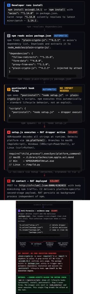 The malicious releases stayed live for about three hours before removal. During that window, any fresh install that resolved to those versions could trigger the payload automatically through npm’s install process, even though the core Axios application logic itself was not visibly altered.
