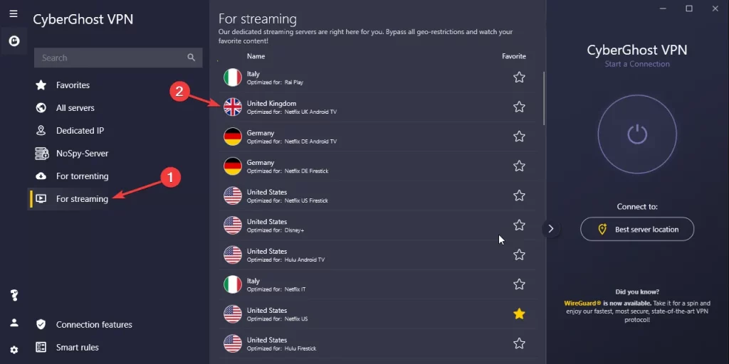 Follow this step-by-step guide using CyberGhost. We recommend it for its exceptional speeds, robust security features, and extensive network.