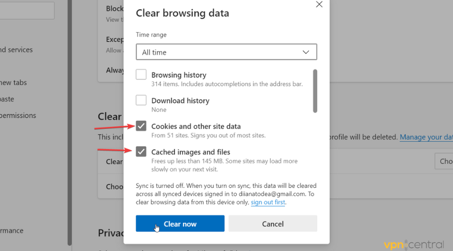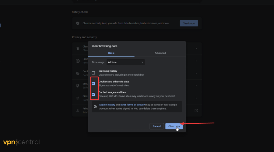 4. Check the boxes for Cached images and files and for Cookies and other site data and select Clear data.
