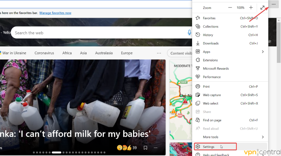 1. Go to the menu and click on Settings.Edge shows menu and Settings