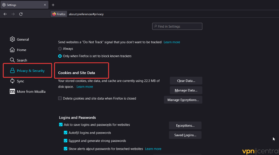 2. Select the Privacy and Security submenu and scroll to Cookies and data.