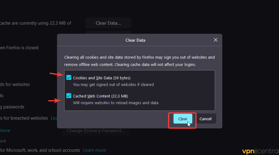 4. Check the boxes for Cached images and files and for Cookies and other site data and select Clear data.