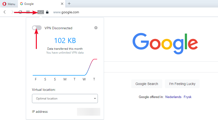 Alternatively, if your Opera VPN extension is enabled, you can disconnect it from the address bar by clicking on VPN and then turning it off.