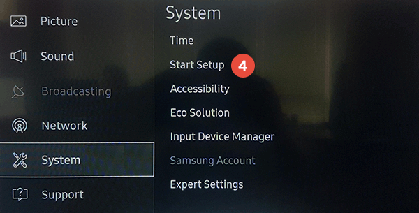 6. Once the reset is finished, select System from settings, then select Start Setup. Enter the PIN and select OK.