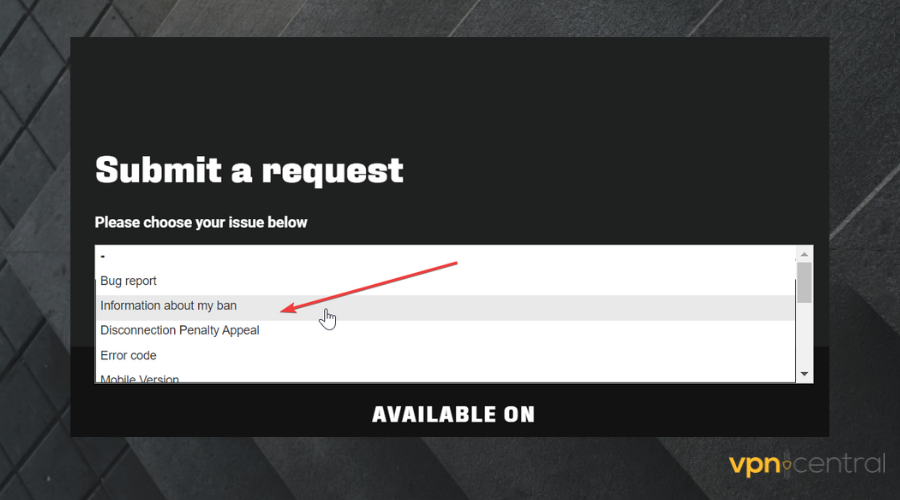 - Under Description of the issue/request, explain your situation and why you think you have been banned by mistake.