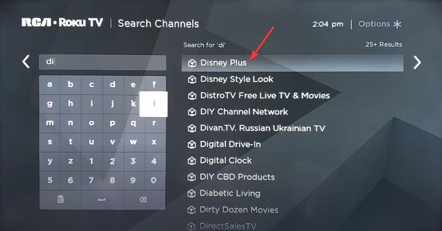 4. Select Disney Plus and press OK.searching disney plus roku store