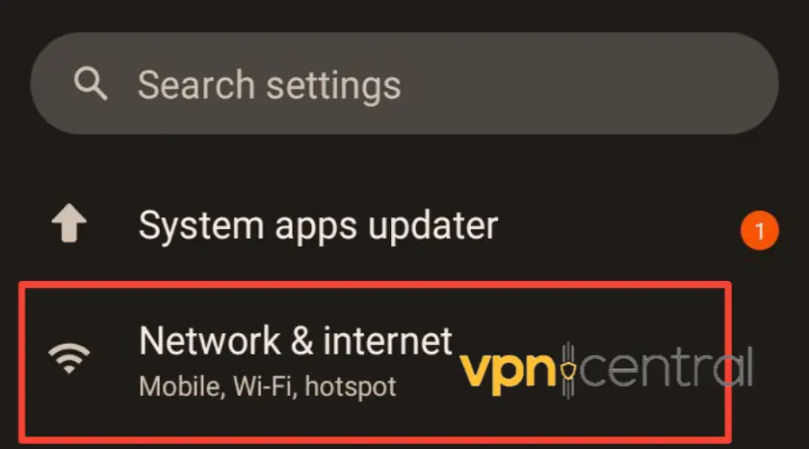 - Scroll down and tap on Network & internet. If you can’t find it, search for VPN.
