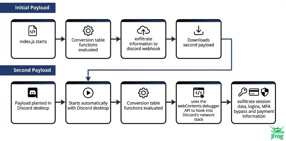 duer-js installs an infostealer that harvests browser and wallet data, hijacks the Discord desktop client to steal tokens and payment info, and uploads stolen files to attacker-controlled endpoints. The primary research and full cleanup steps are available from JFrog.