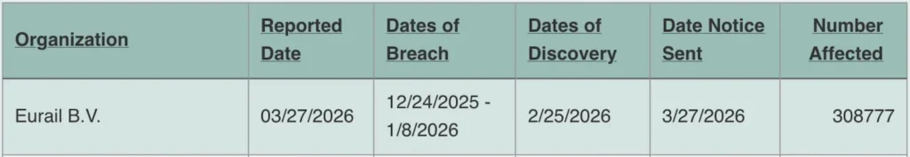 Eurail’s public incident page does not list a total number of victims. However, multiple reports citing Eurail’s filing with the Oregon Attorney General say the breach affected 308,777 individuals. That figure appears to be the clearest public count available right now.