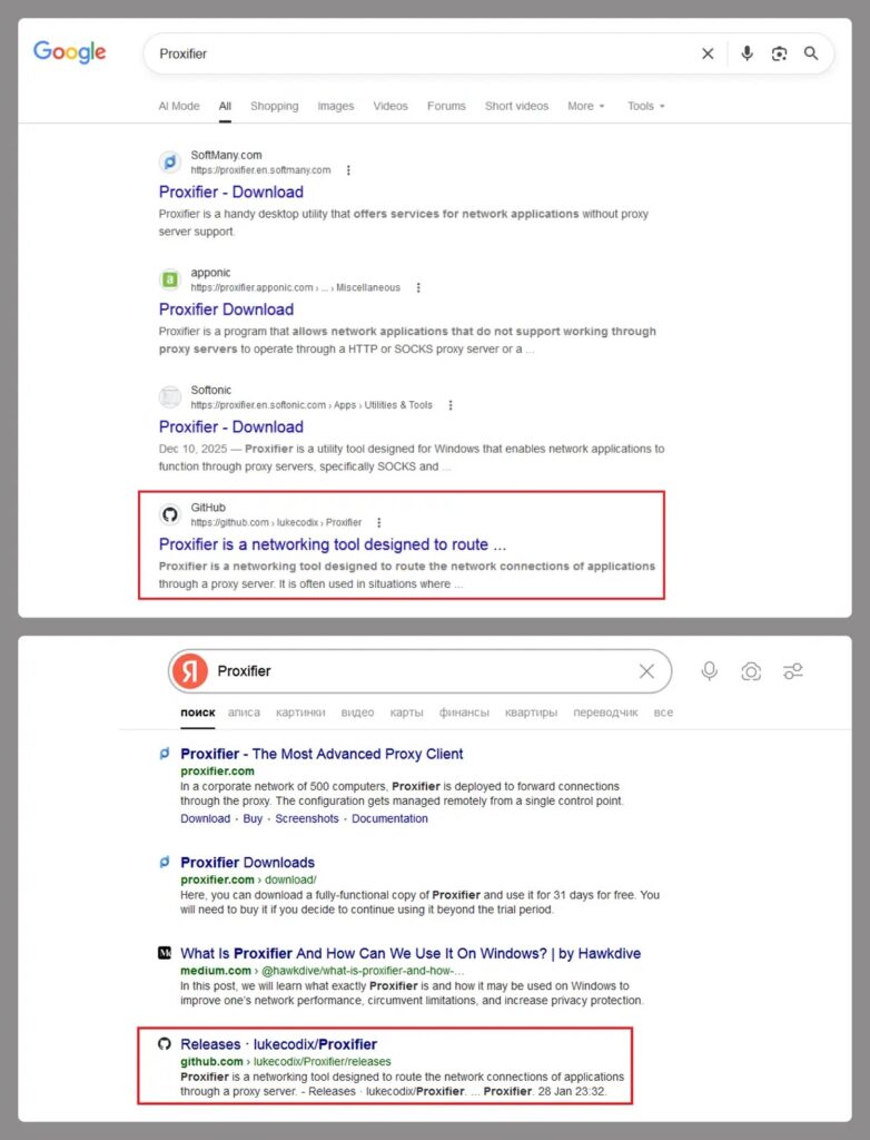 Kaspersky says victims usually search for “Proxifier,” land on a malicious GitHub repository, download a trojanized release archive, and run an executable that launches both the real installer and the malware chain.