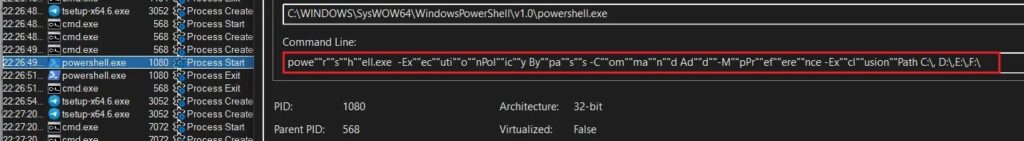 K7 says the malware first uses cmd.exe to look for a process named 0tray.exe, which appears to function as an infection check. It then decodes and runs a PowerShell command that tells Microsoft Defender to exclude drive partitions from scanning. That gives later stages more room to operate without being flagged.