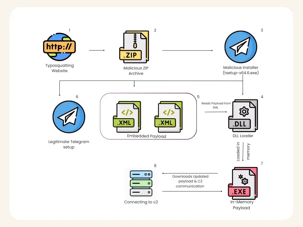 The campaign also hides behind a real Telegram installation flow. K7 says the malicious package silently deploys a legitimate Telegram executable so the user still sees what looks like a normal install, while the malware continues in the background.