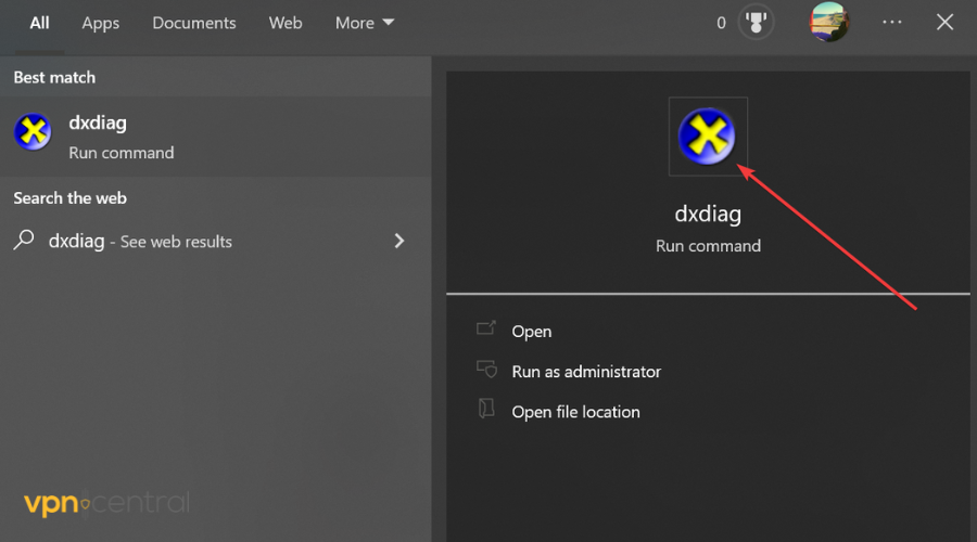 2. To access dxdiag, select it from the list of search results.