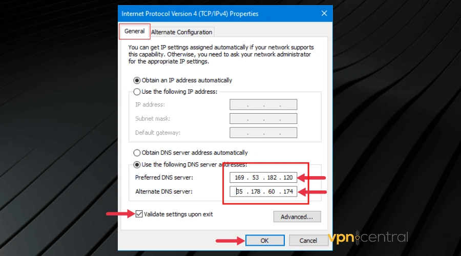 - On the General interface, tick the Use the following DNS server addresses option.