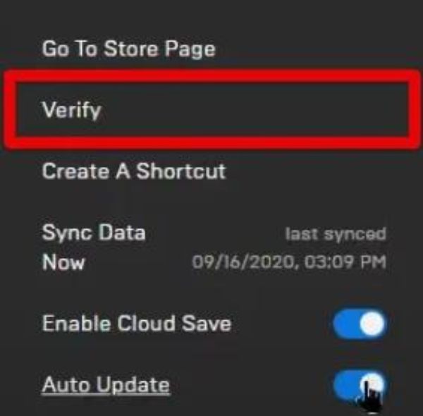 - In your game library, click on the burger menu for Fortnite and select Verify.