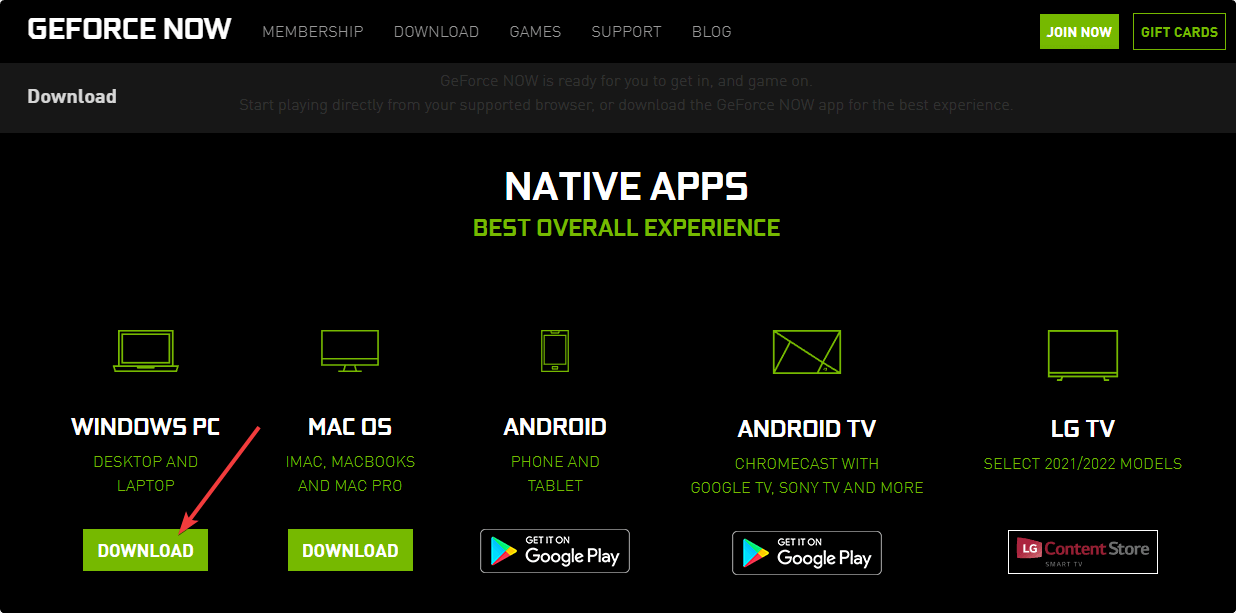 - Visit the GeForce Now download page.