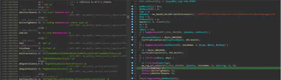 Registry changes also matter here. Splunk says the malware uses Run keys and RemoteAccess-related service paths for persistence, so defenders should flag unexpected writes in those areas and investigate any service-related DLL references that do not match known-good software.