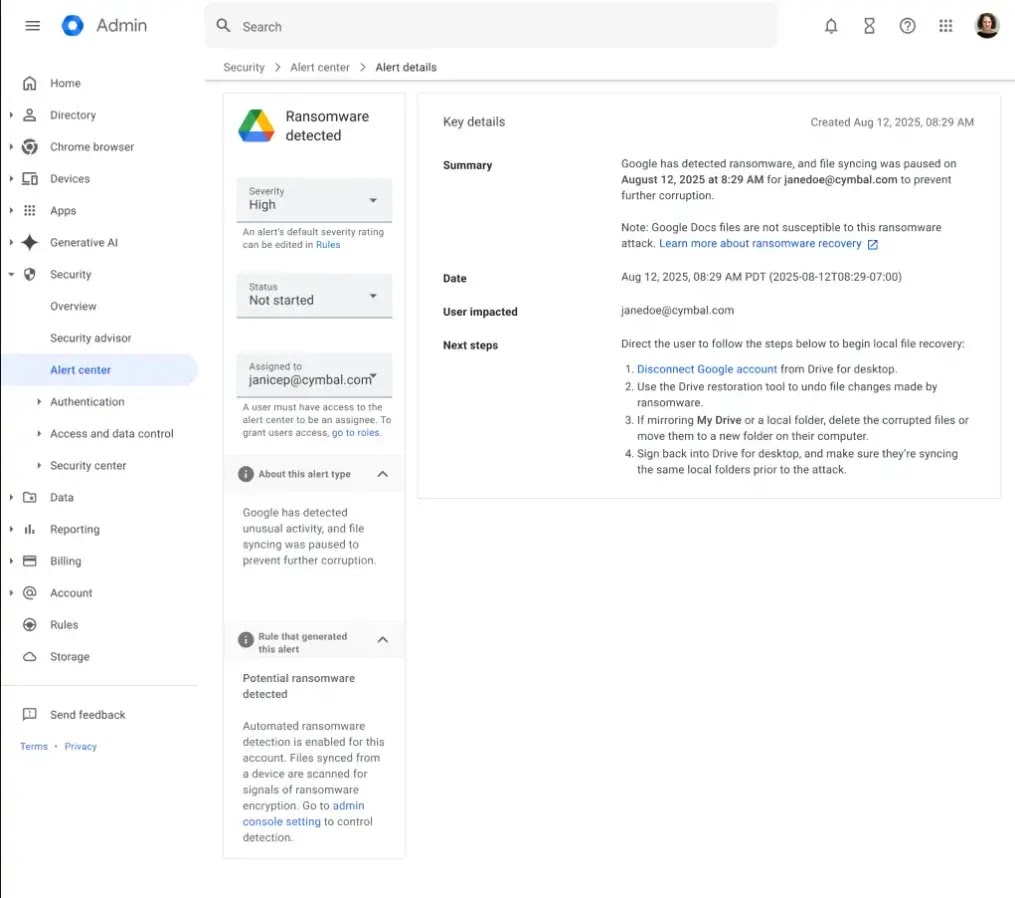 Admins also get notified. Google says ransomware detections trigger emails to administrators and alerts in the Admin console Alert center, while affected users receive their own notifications and recovery guidance.