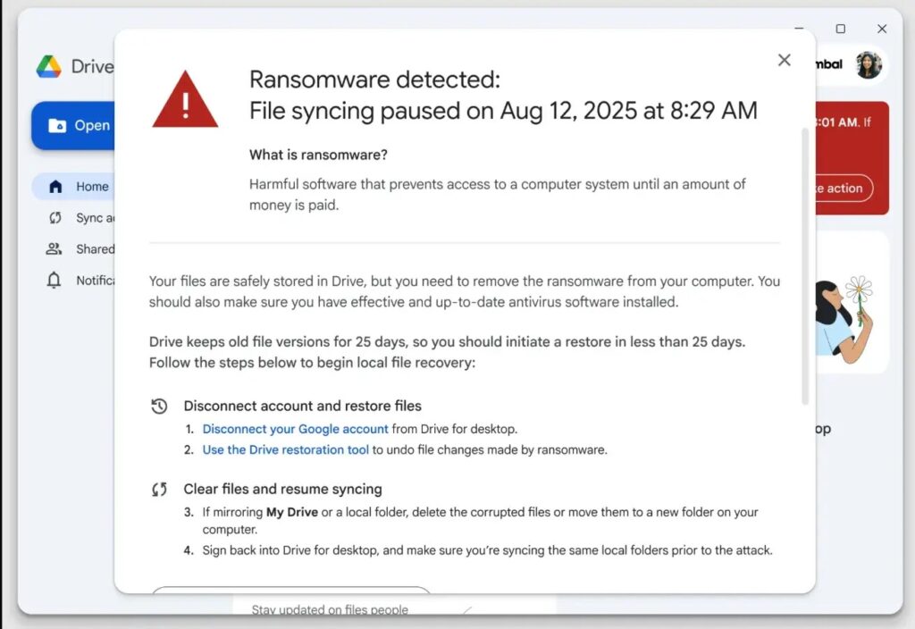 Users on Drive for desktop version 114 or later also get local desktop alerts. Google says older versions still stop syncing when ransomware is detected, but they do not show those pop-up warnings on the device itself.