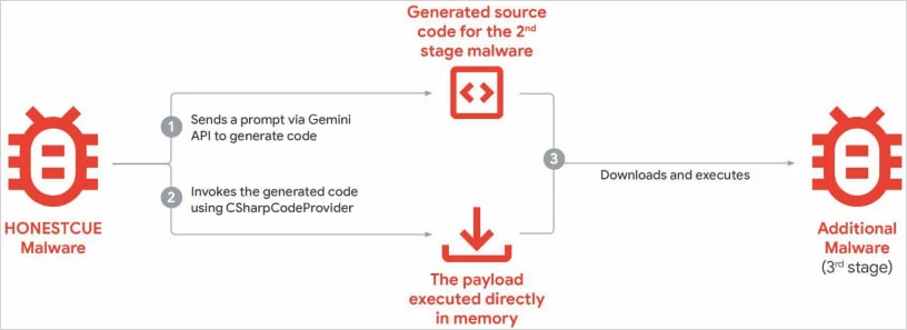 - HonestCue is a proof-of-concept malware that uses the Gemini API to generate C# code for second-stage payloads and execute them in memory.