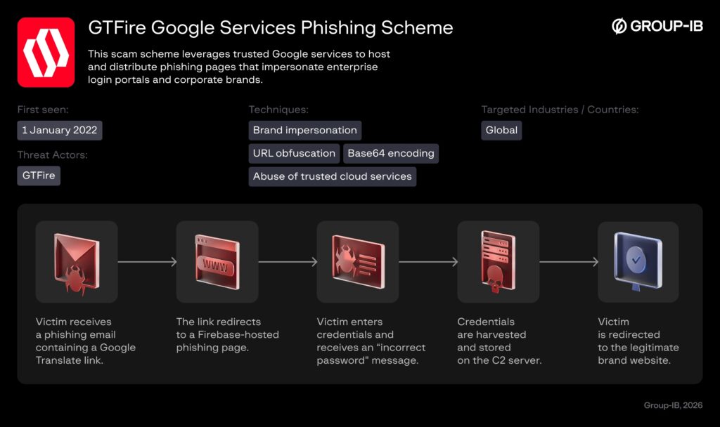 GTFire phishing scheme uses Google Translate and Firebase to steal login credentials worldwide. Attackers hide behind trusted Google domains to bypass email filters and security gateways. Victims enter details on fake brand pages, then get redirected to real sites unaware of the theft.