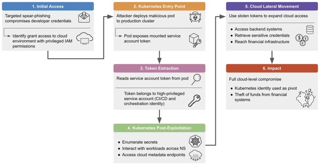 The researchers say the intrusion then moved beyond the cluster itself. The attackers reached backend systems and financial infrastructure, showing how Kubernetes identity abuse can become a broader cloud compromise instead of a limited container incident.