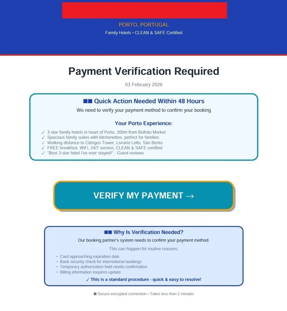 | Urgent request to “verify” or “complete” payment | Pressure reduces the chance the guest will verify independently |