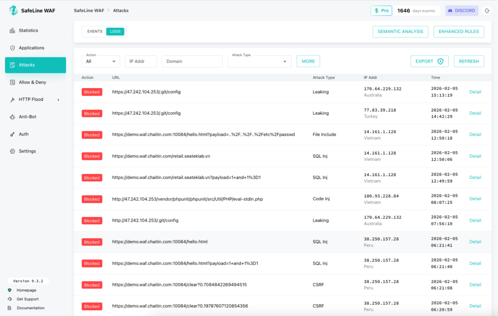 For most SaaS teams, the most useful SafeLine features are rate limiting, anti-bot challenge, and authentication challenge for sensitive routes, plus standard WAF protection for common web attacks.