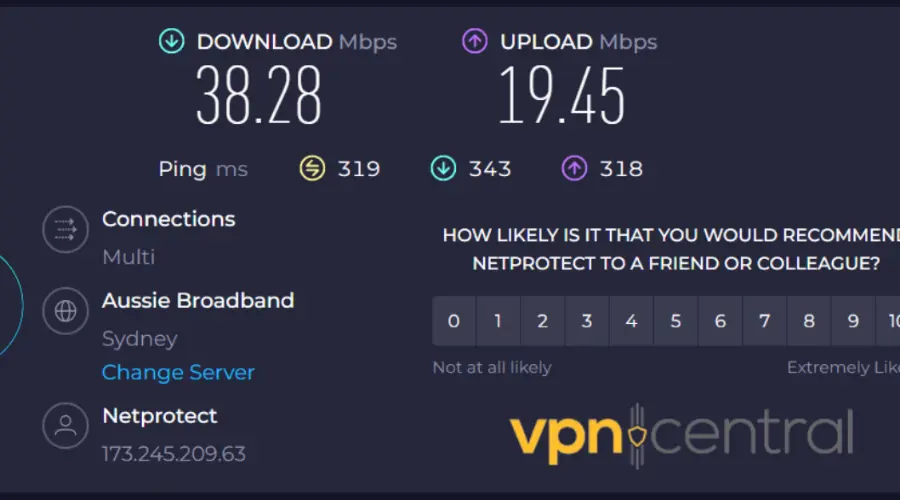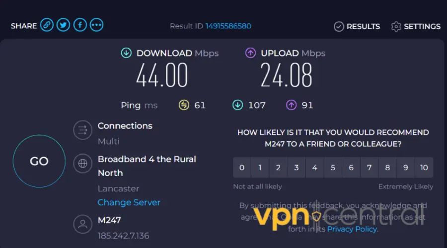 In the UK, our speed test showed that the obfuscated server had an average download speed of 44.00 Mbps.