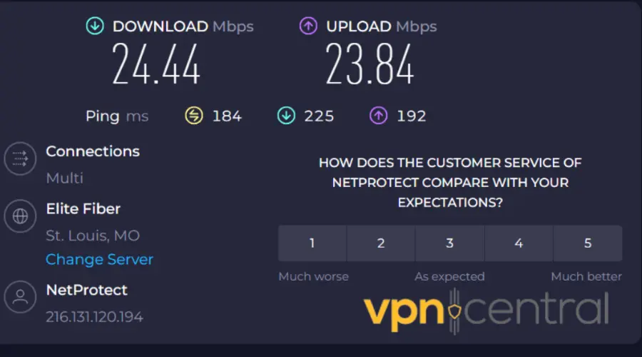 Compared to the speed without a VPN connection, the server in the US had an average download speed of  24.44 Mbps