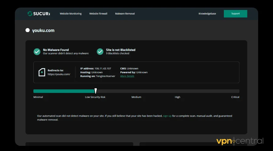 YouKu appears to be safe based on the security checks I conducted. All tests returned clean results except for Malcure’s false flag.
