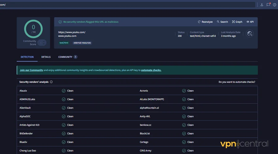 Running it on YouKu reveals nothing alarming from 60+ checks. The databases of reference include BitDefender, Fortinet, Google Safebrowsing, and more.