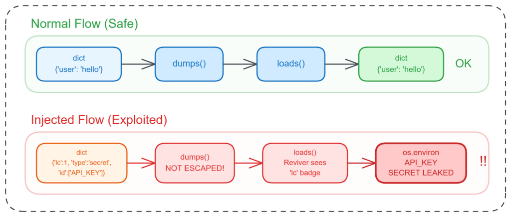 The second flaw, CVE-2025-68664, is the most severe of the three. GitHub says LangChain’s dumps() and dumpd() functions failed to escape free-form dictionaries containing the internal lc marker, which could cause untrusted input to be treated as a real LangChain object during deserialization. That can expose API keys, environment variables, and other secrets when apps deserialize attacker-controlled data.