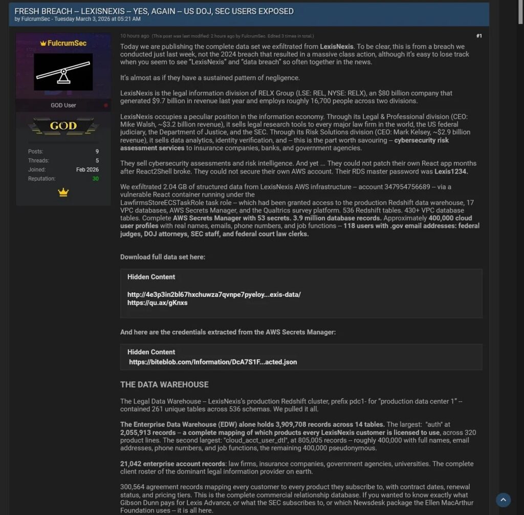 | FulcrumSec claims 2.04 GB was stolen from LexisNexis Legal & Professional | Alleged | I found references to the claim, but no public company breach notice or SEC-style filing confirming it yet. |