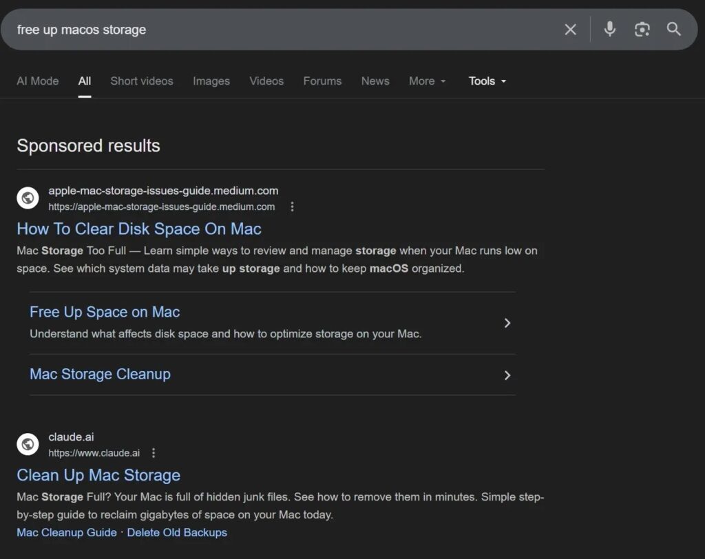 - Scroll past sponsored results for software and “Mac cleanup” searches, especially when you see oddly formatted URLs.
