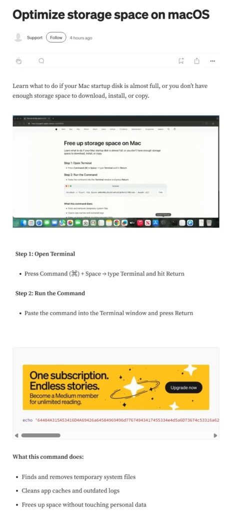 | 2. Landing page | A “help article” on a familiar platform | The page imitates a guide and prepares the copy-paste trap |