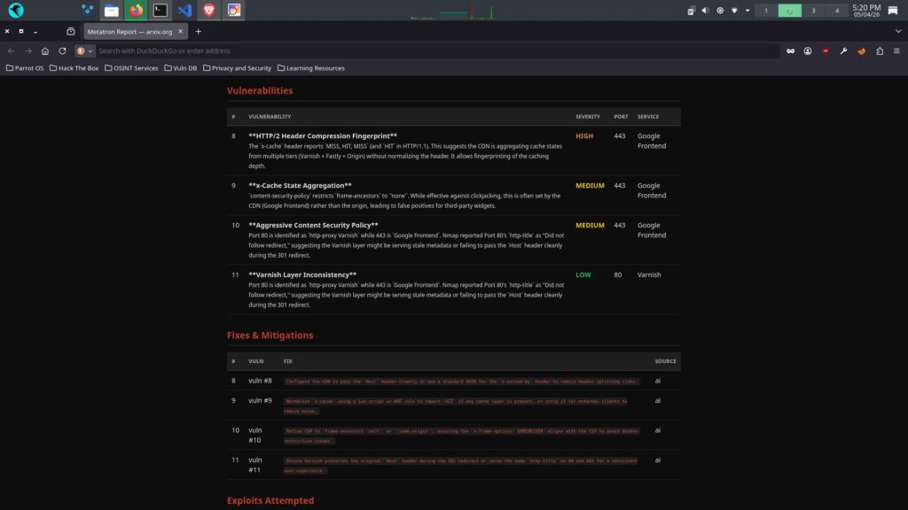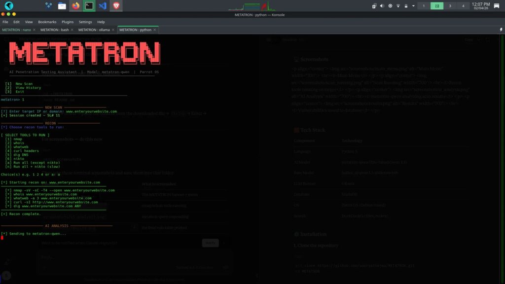 In simple terms, METATRON is a Linux pentesting assistant that automates recon, passes the results into a local model, and then generates vulnerability analysis, exploit suggestions, and remediation advice. The project currently targets Parrot OS and other Debian-based systems, based on its published setup steps and package requirements.