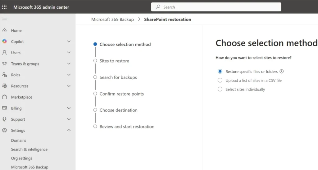 Microsoft’s documentation presents this as an admin workflow inside Microsoft 365 Backup, not a self-service end-user feature.